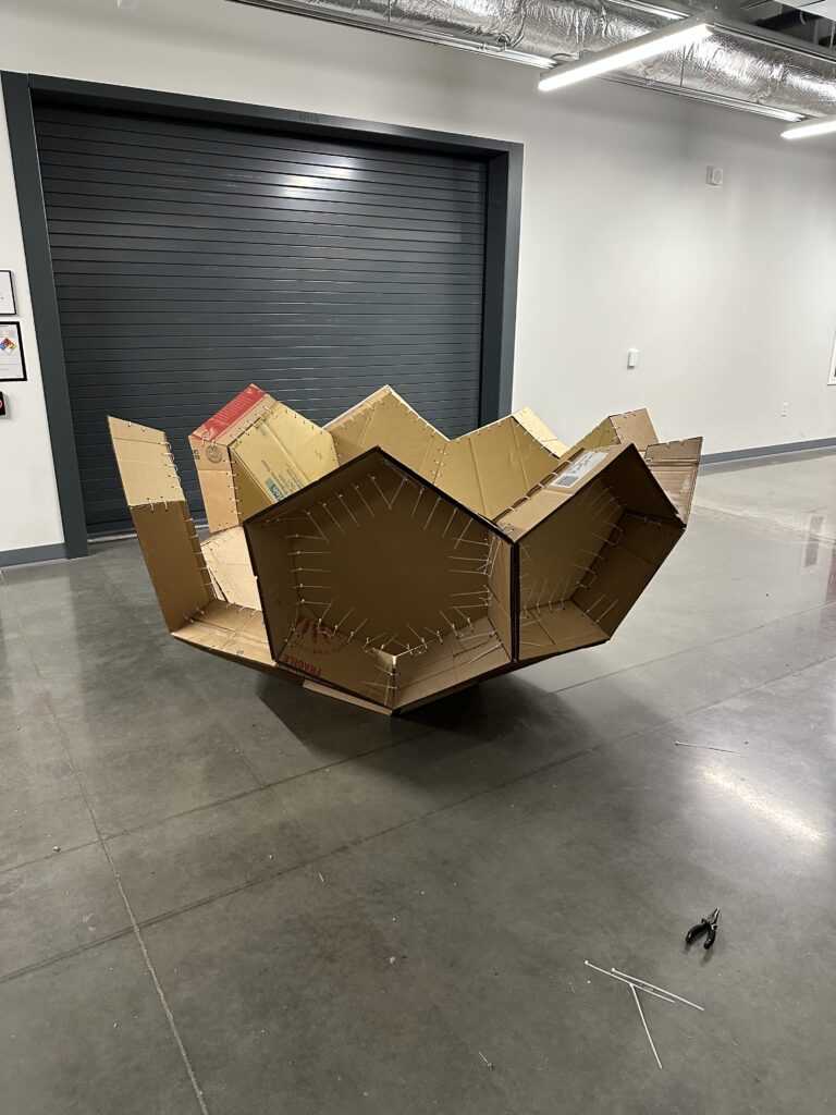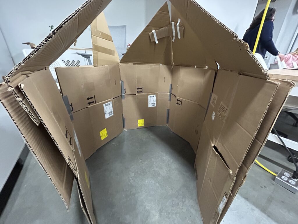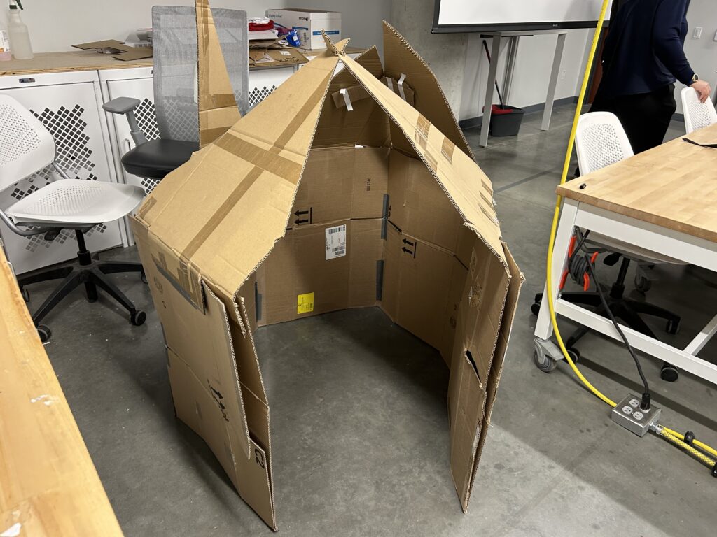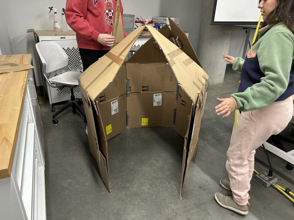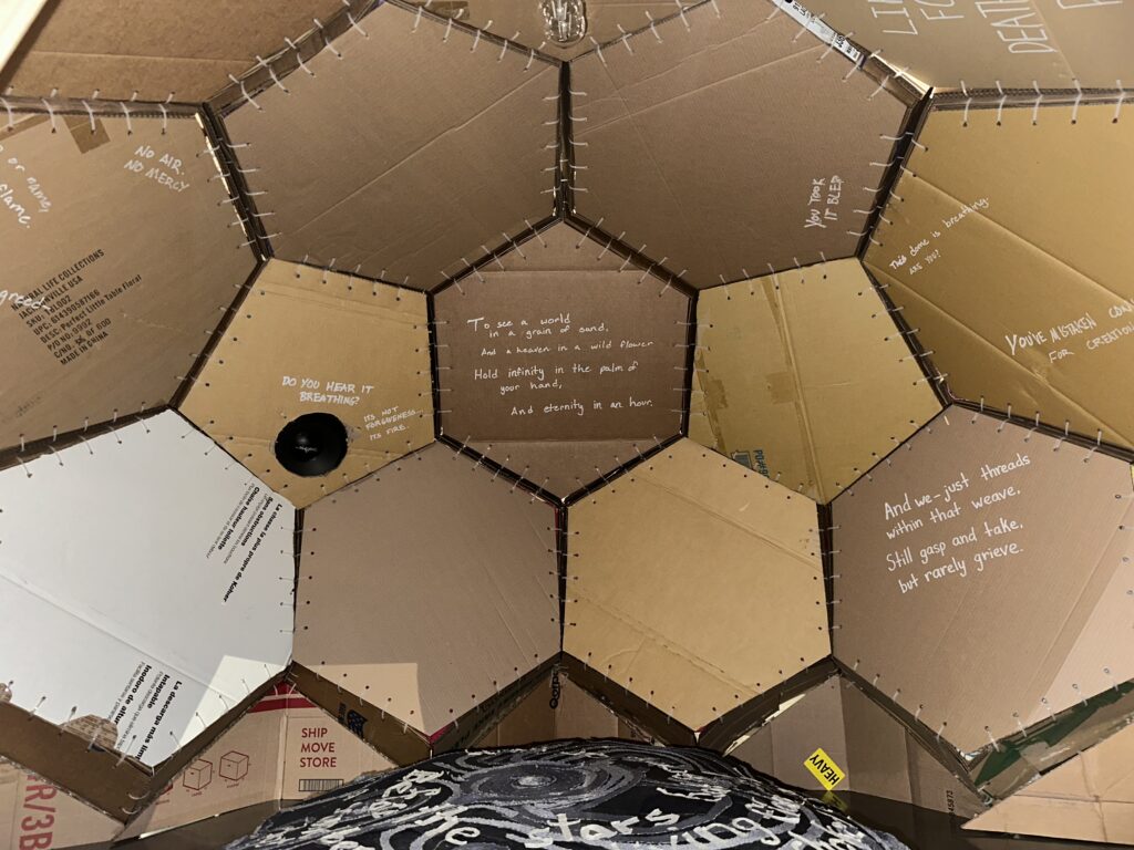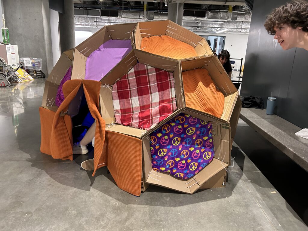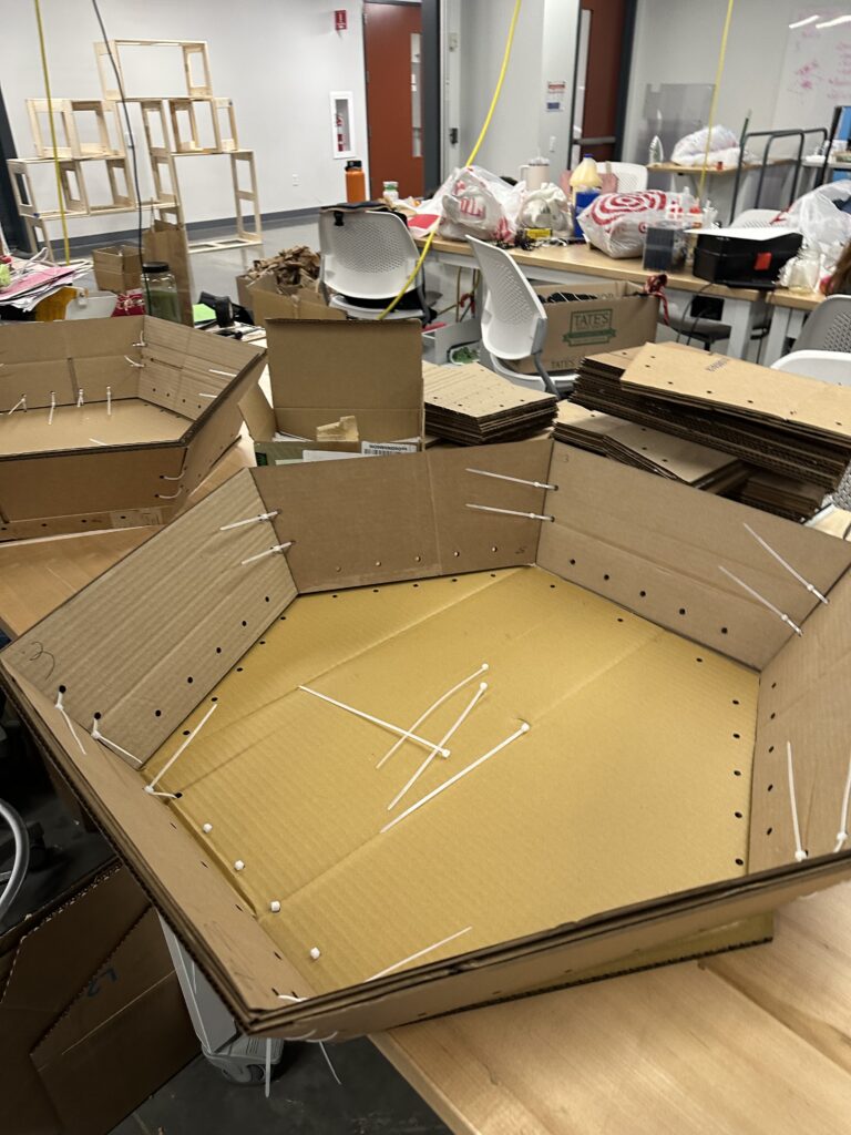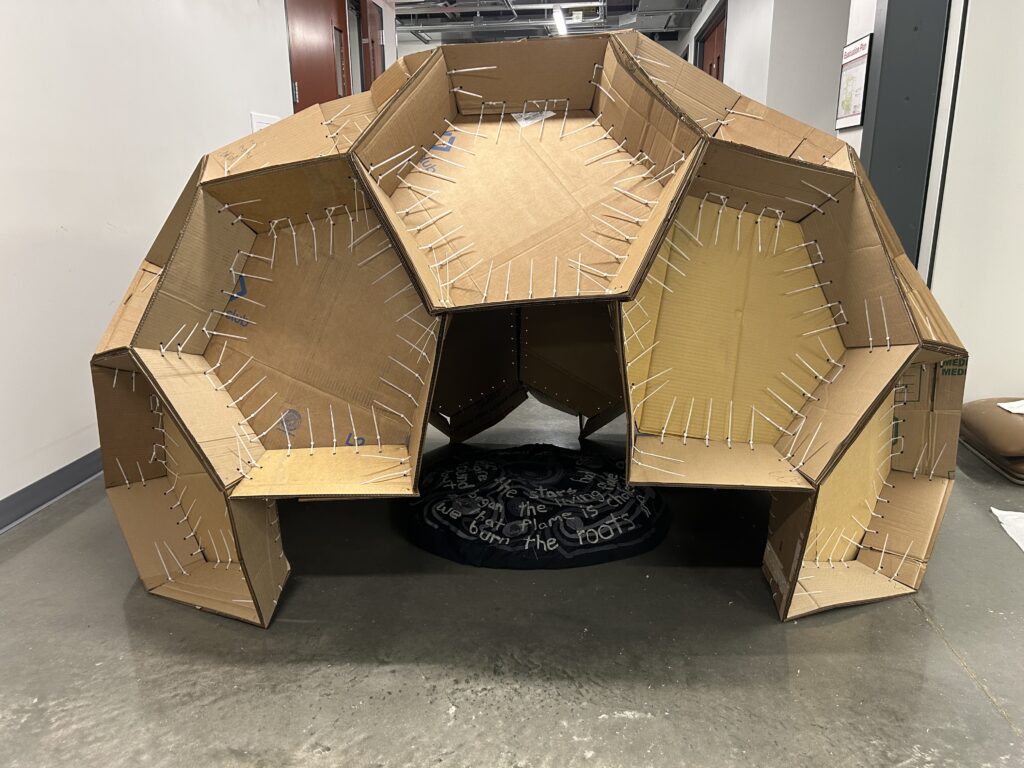 Team members experienced with laser cutting suggested using cardboard from dumpster diving as our primary material, allowing us to keep the dome sustainable. They designed the panels with small holes around the edges so everything could be zip-tied together. While the zip ties weren’t recycled, nearly everything else was, including the electronics housing, built from leftover cardboard and fabric.