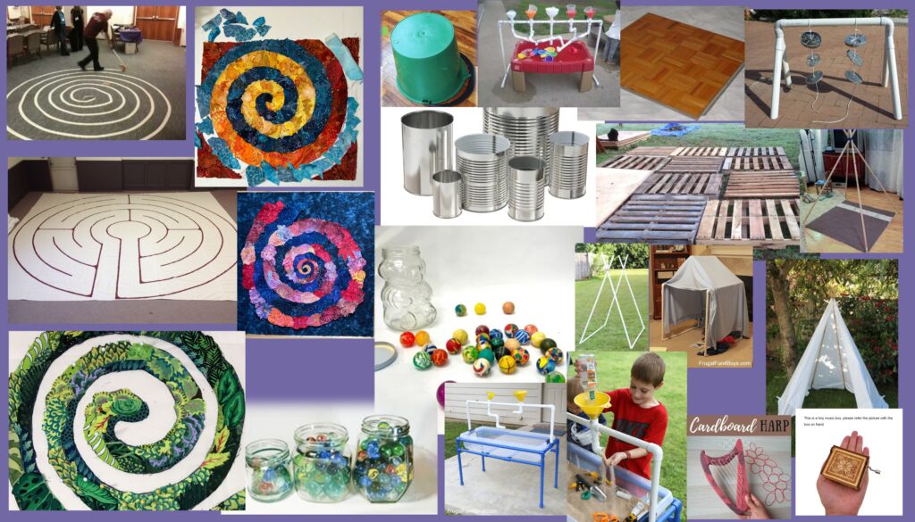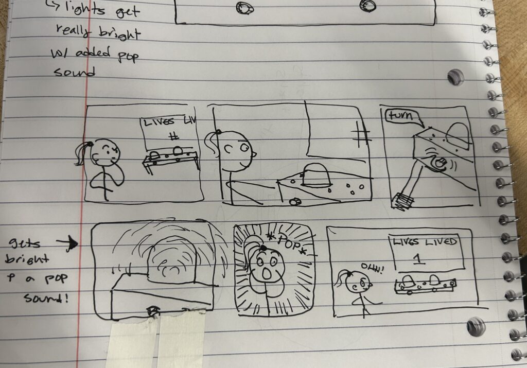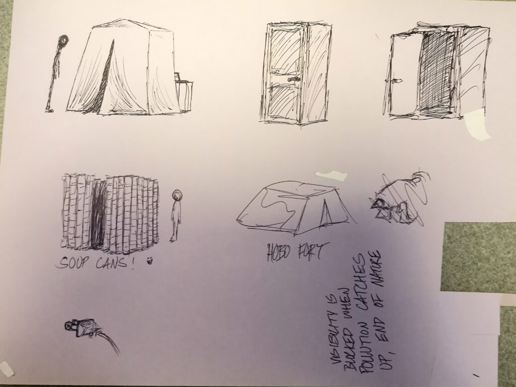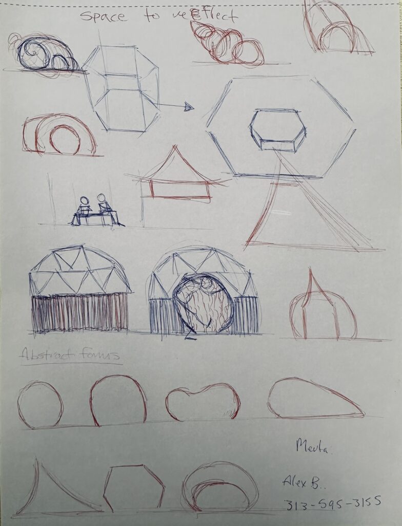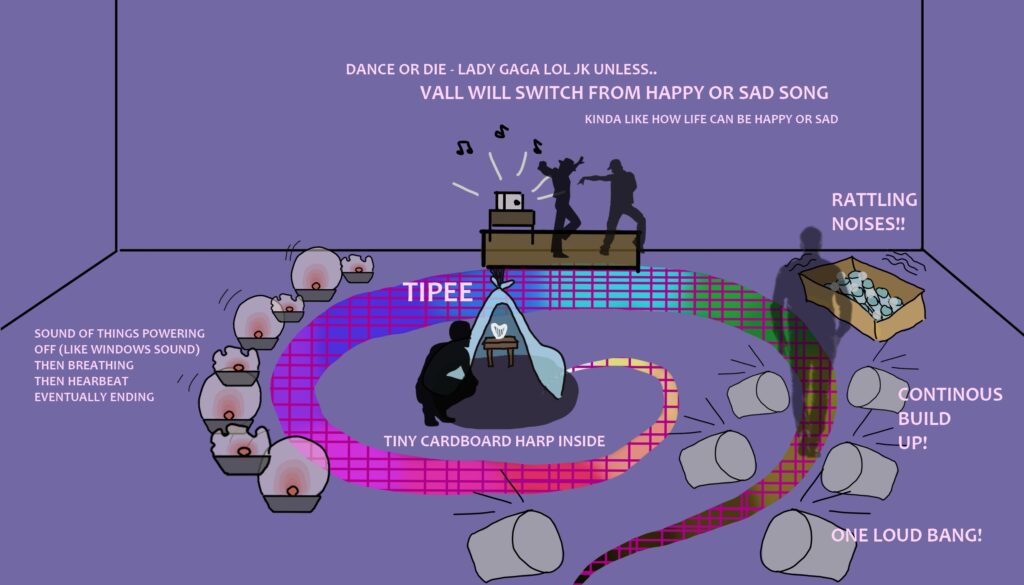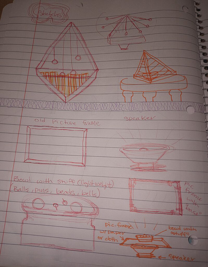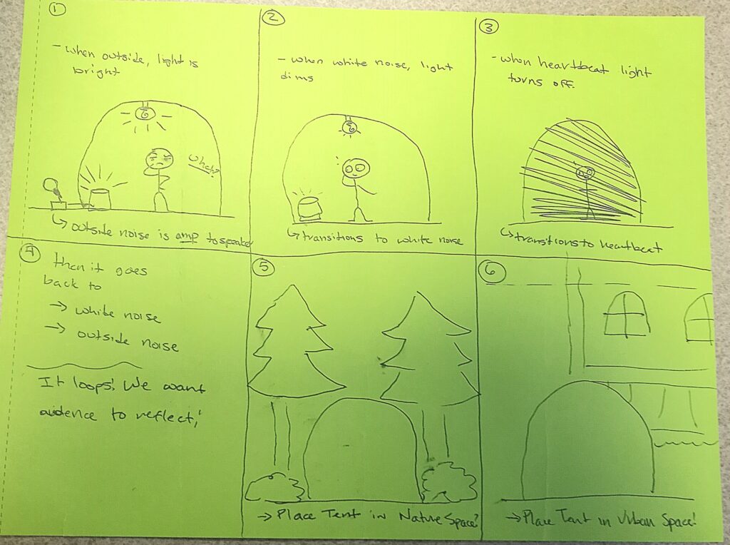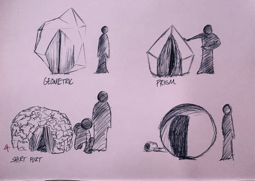 Before settling on the dome structure, we spent a lot of time sketching and experimenting with different ideas. We tried building early concepts and even created small objects to explore how they could produce unique sounds. One material we experimented with was metal—its harsh, screeching quality stuck with us and ultimately made its way into the final audio composition. Sketching played a huge role in our ideation process. We drew multiple versions of structures, from tents to abstract forms, and created storyboards to visualize how people might move through and experience the project. These visual exercises helped us better understand the emotional tone we wanted to evoke and guided us in shaping the final installation.