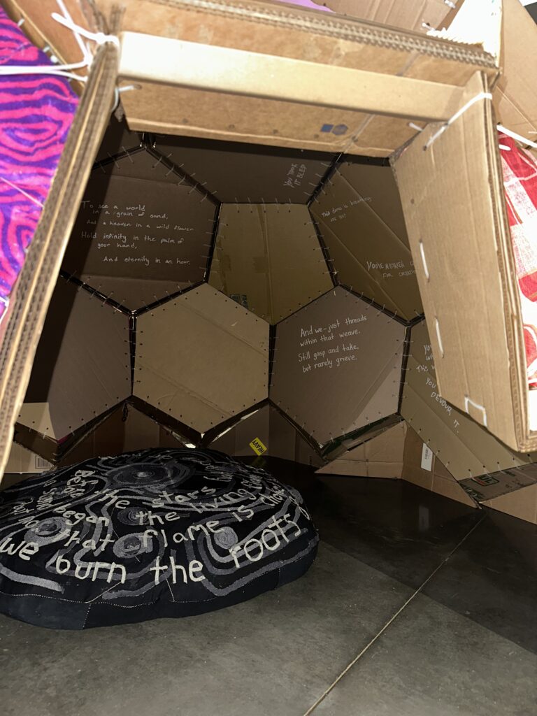 After countless hours cutting cardboard panels, assembling the dome, sewing the cushion, and composing the soundscape, we finally began putting everything together for the final exhibition. This was where all the components; digital, physical, and sensory, had to work in harmony. We installed two speakers inside the dome, hidden within the walls, with all wiring routed to the back of the structure. Two black lights were suspended from the dome’s peak, casting an eerie glow inside. Using white ink, we handwrote poems and fragments of thought across the inner walls, meant to illuminate under the black light and reinforce the dome’s meditative, unsettling tone. The intent was to create an atmosphere that made people pause, reflect, and feel just enough discomfort to reconsider their relationship with the climate crisis.