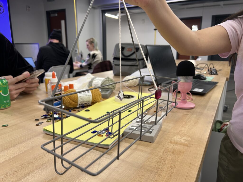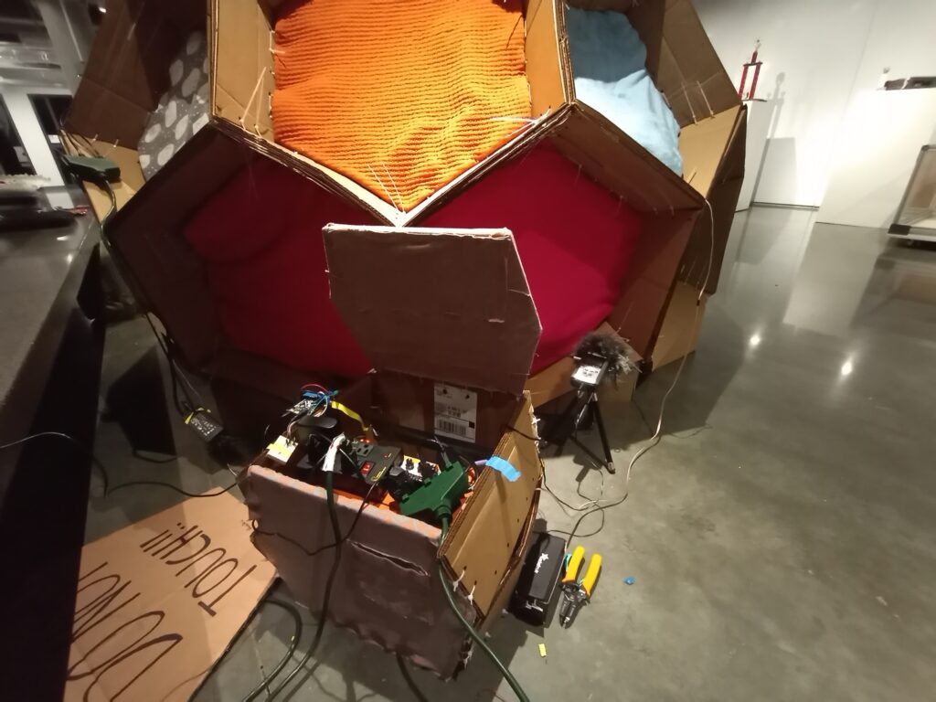 The cushion, built from recycled T-shirts and old blankets, triggered the entire experience when someone sat on it, activating the lights and starting the audio track. But the sensor was one of our biggest challenges. Wiring proved more difficult than expected, and the first sensor broke when it was accidentally yanked out during setup. It took nearly four hours just to reassemble and troubleshoot the Arduino and all related wiring. Once working, the sensor still required recalibration almost daily for the first three days of the exhibition. We also integrated a microphone with distortion effects into the dome, which needed its own careful wiring and audio adjustments.