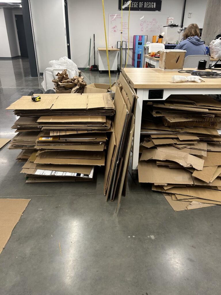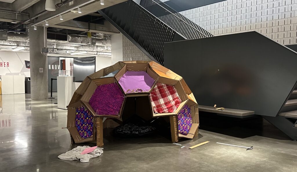 Audience responses varied: some people stayed for just one audio loop, while others lingered through multiple cycles, letting the layered soundscape and poetic visuals settle in. In the end, our dome was approximately 98% recycled. We spent only about $130 in total; mostly on essentials like hot glue, zip ties, and secondhand blankets and clothing. All cardboard was salvaged from dumpsters. The electronics were returned to the studio for future use, and leftover materials were either given to friends or donated to the College of Design’s materials closet.