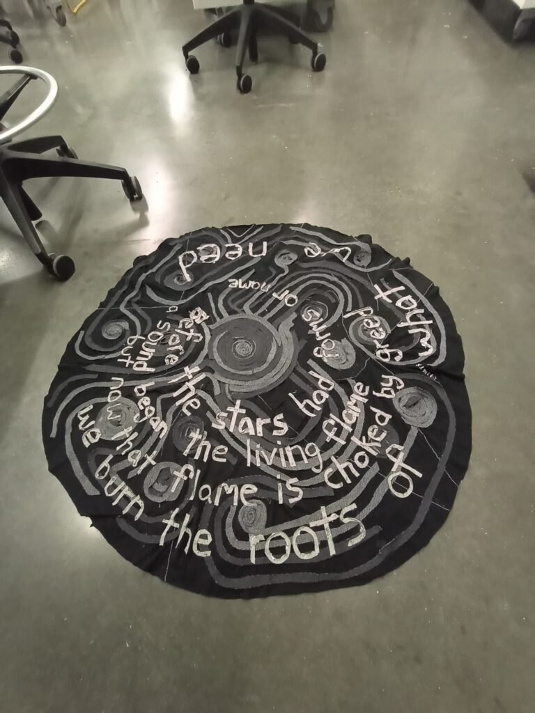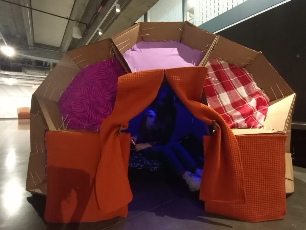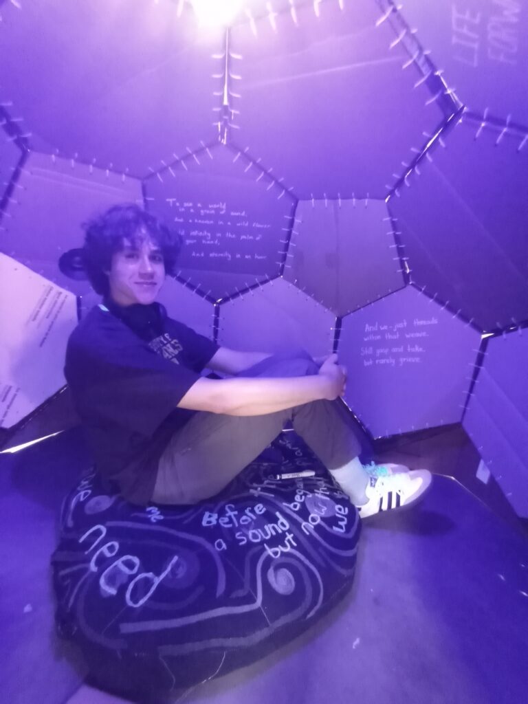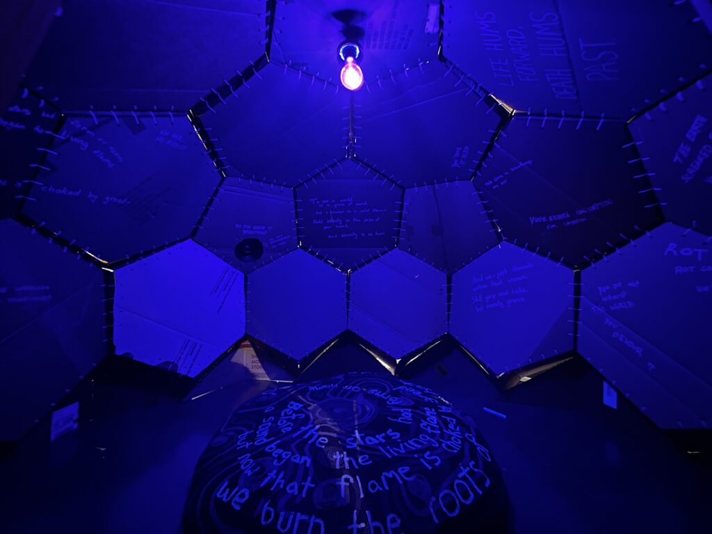 To muffle outside noise, we covered the dome with old blankets. The activation cushion, which triggered the experience when someone sat down, was sewn from recycled T-shirts, with a zipper salvaged from one of them and padding donated by other classmates. Finally, we added a black light inside the dome and wrote poems on the walls; fragments of thoughts and messages that speak to environmental decay and the fragility of all life.