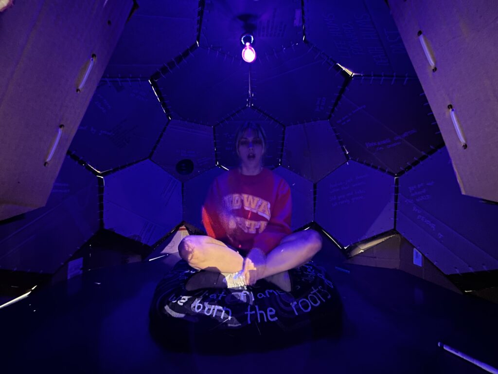 Despite these obstacles, the final result was worth it. It was exciting to watch people interact with the dome, some crawling in cautiously, others curiously drawn to the strange fabrics and sound. While we left white sharpie pens inside to encourage personal contributions, most visitors were hesitant to write or draw unless prompted by a team member. Still, we ended up with a handful of thoughtful doodles and inscriptions that added to the piece. One visitor remarked that the dome “looked warm and inviting from the outside, but felt cold and unsettling inside,” while another said the experience made them “think deeply and feel uncomfortable, but in a necessary way.”