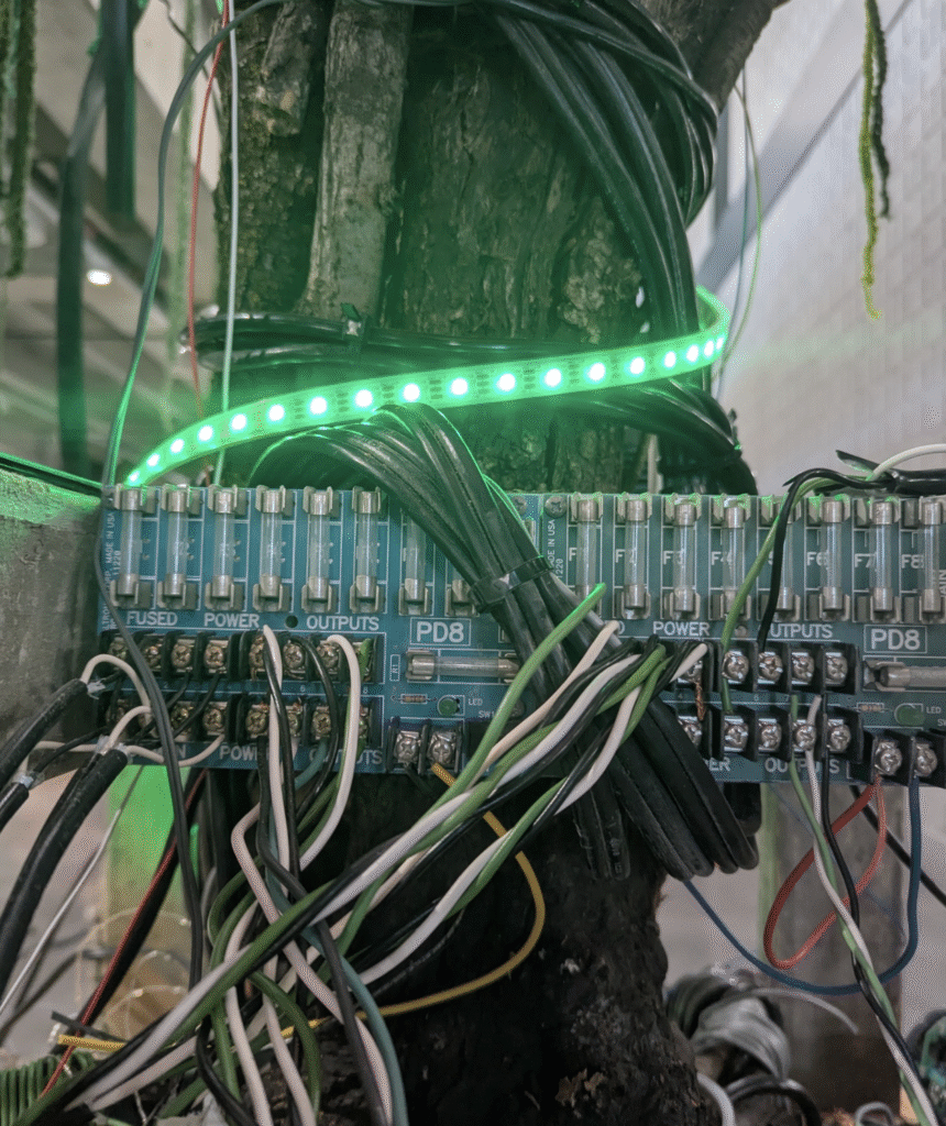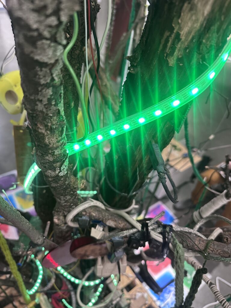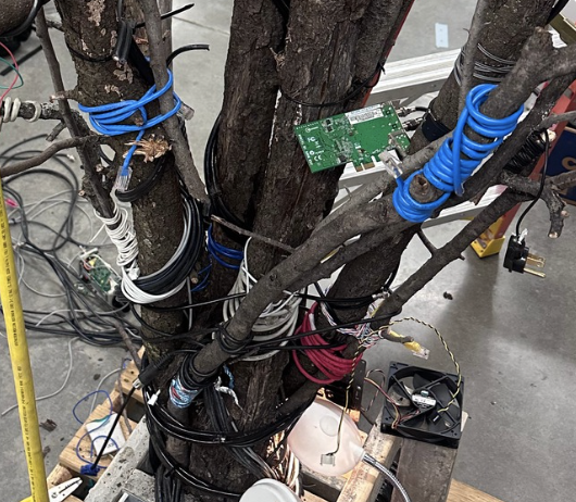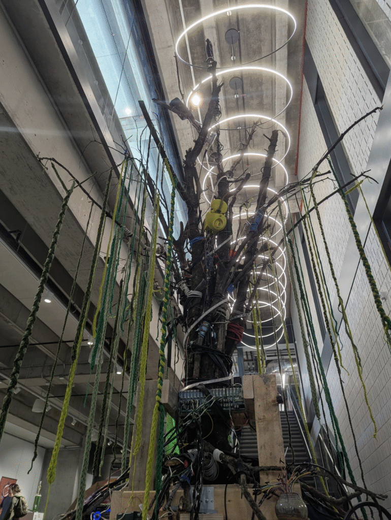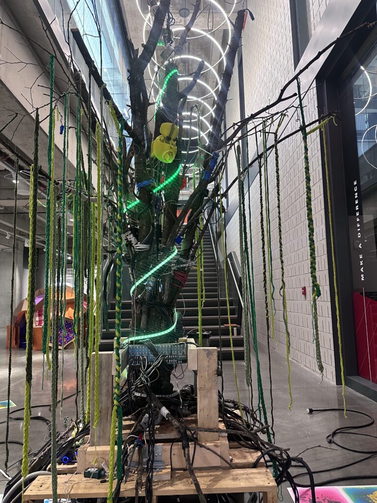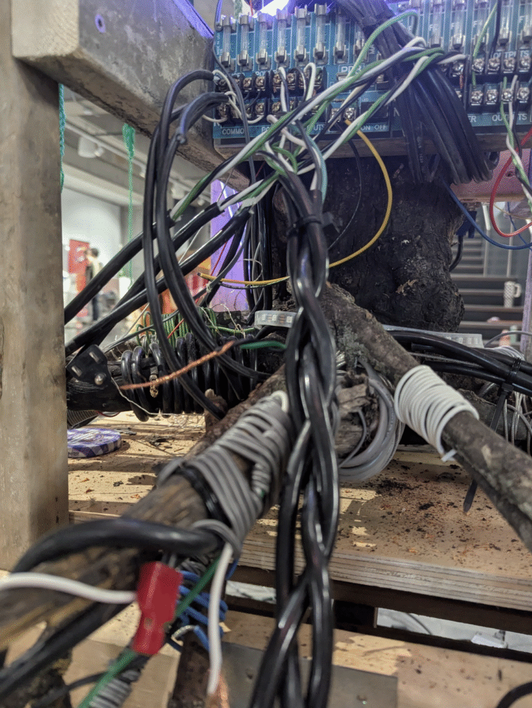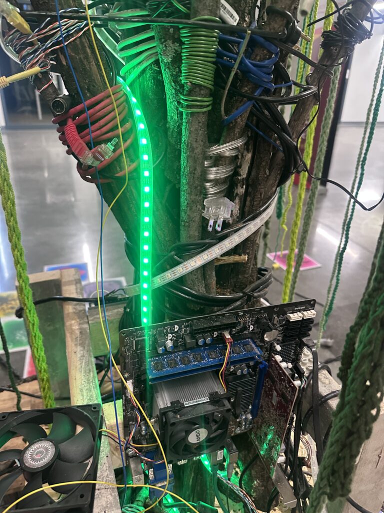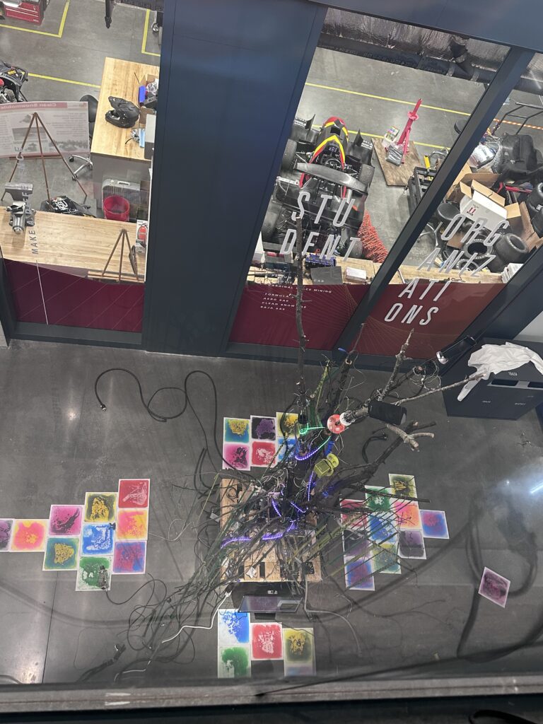 In the end, our project transformed from a collection of isolated ideas into a unified, organic structure that invites interaction and encourages reflection on a pressing environmental issue: electronic waste. Throughout our process, we prioritized using found and salvaged materials, grounding the project in sustainability from the start. Almost every element in the installation was repurposed—from a real tree we discovered dead near campus, to discarded wires, broken electronics, and other e-waste materials that would have otherwise contributed to the landfill crisis. This intentional use of found objects not only gave our work authenticity but also challenged us to rethink the value of what is often considered trash.