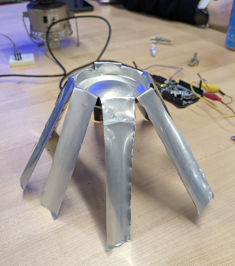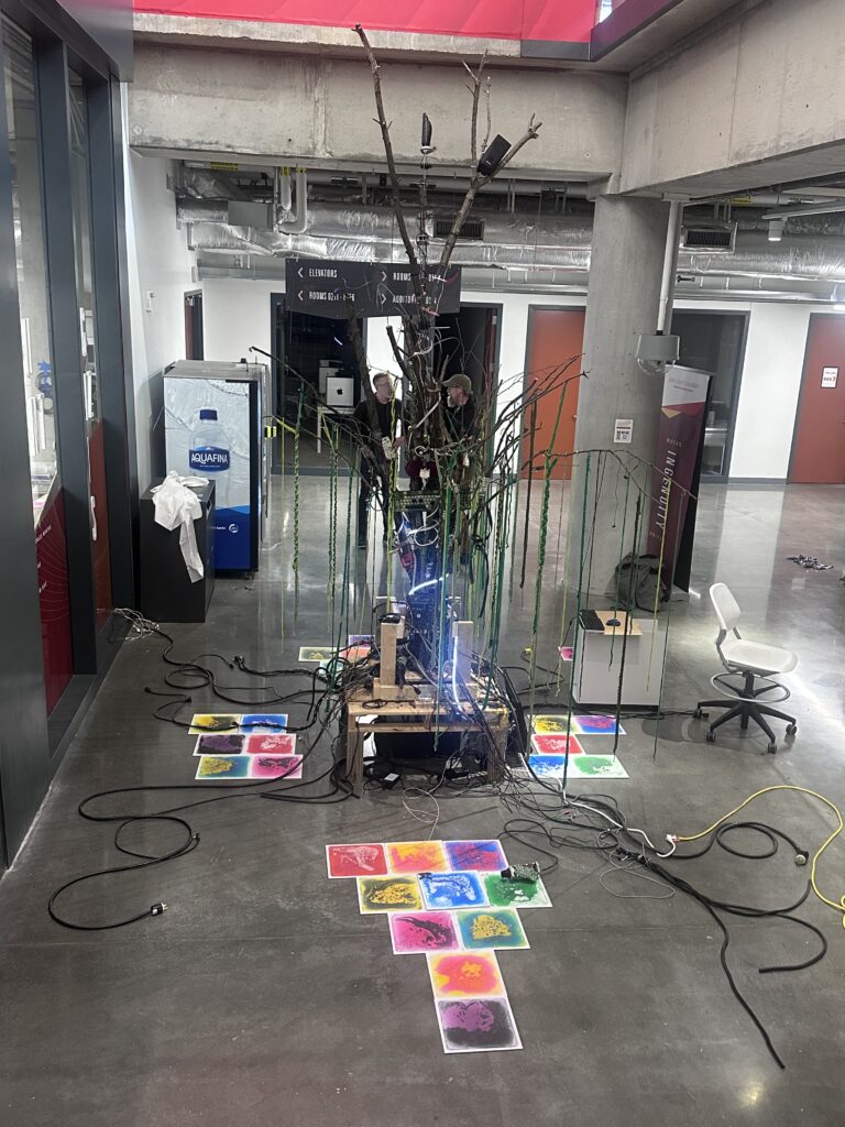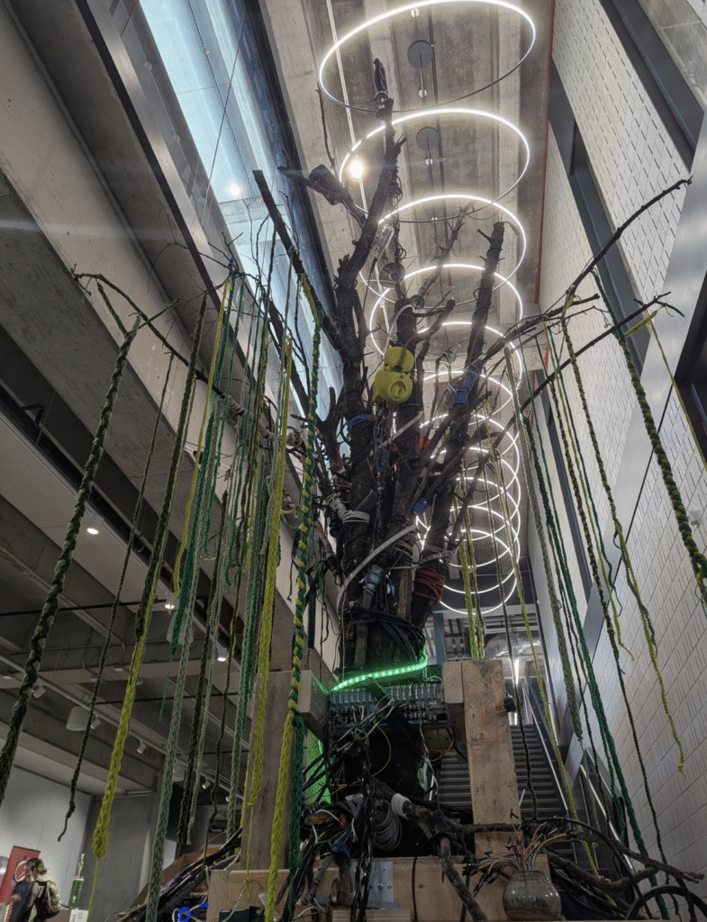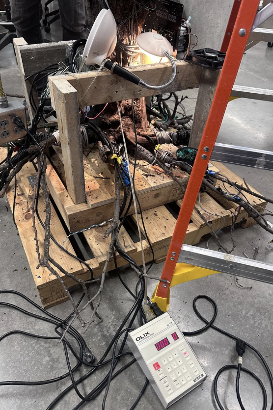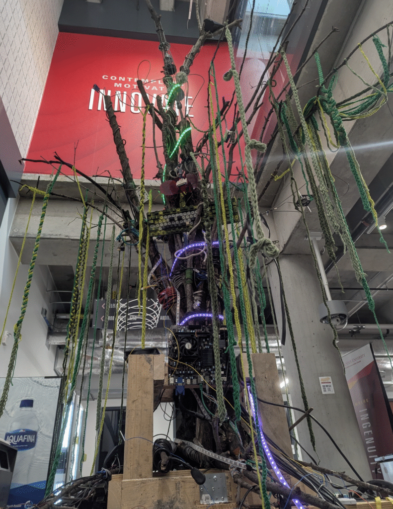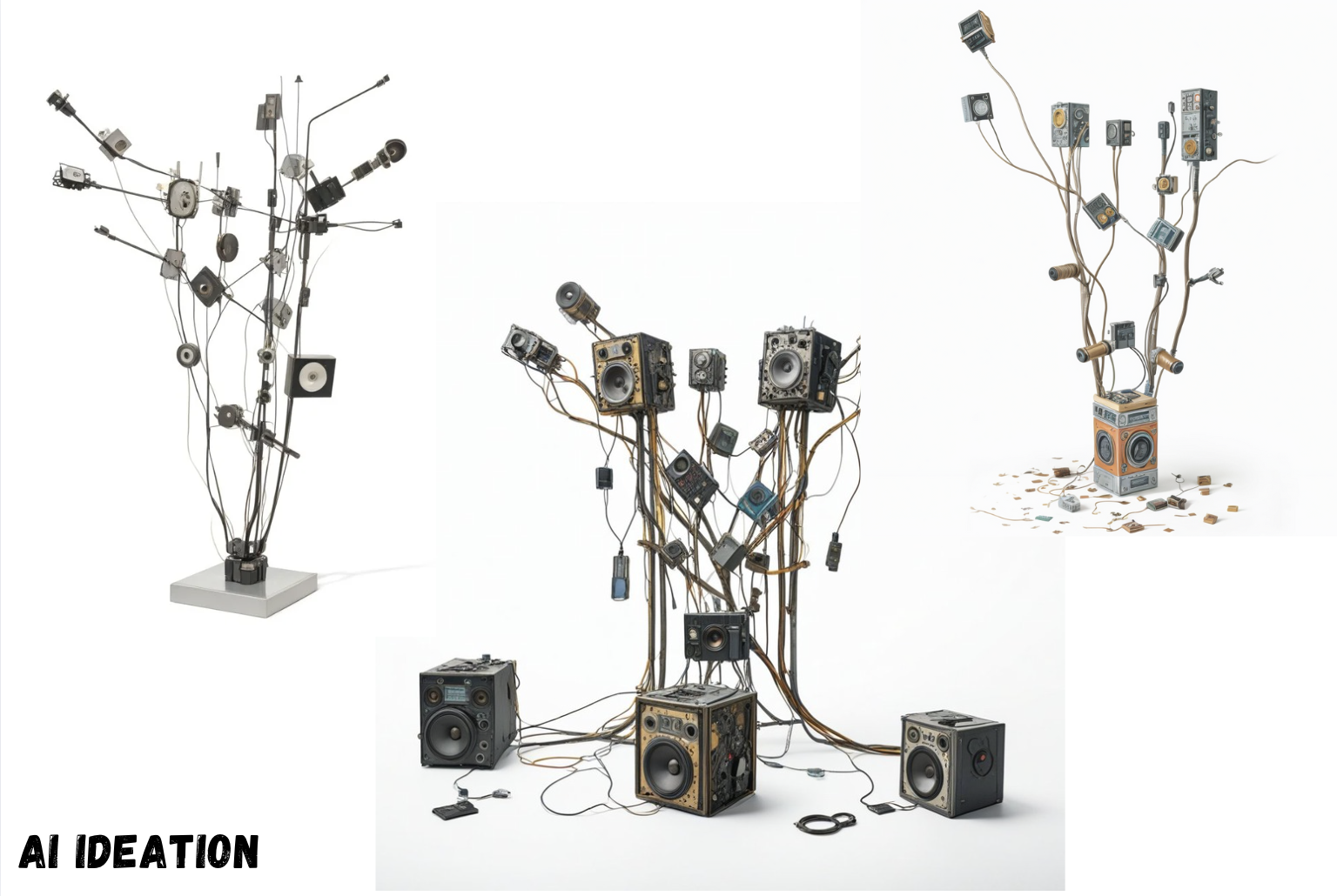 The final form—a plant-like, half-organic, half-electronic hybrid—embodies the tension between the natural and technological worlds. The wires emerging from the roots, the layering of e-waste components, and the embedded speakers and soundscape create an unsettling but immersive experience. It is meant to reflect how deeply entangled we are with technology, and how that relationship impacts our environment. Our installation speaks to this growing crisis and reminds viewers that while this is a global problem, it carries local responsibility. Through our design, materials, and interactivity, we hope to encourage others to consider their role in the life cycle of electronics—and imagine more sustainable futures.