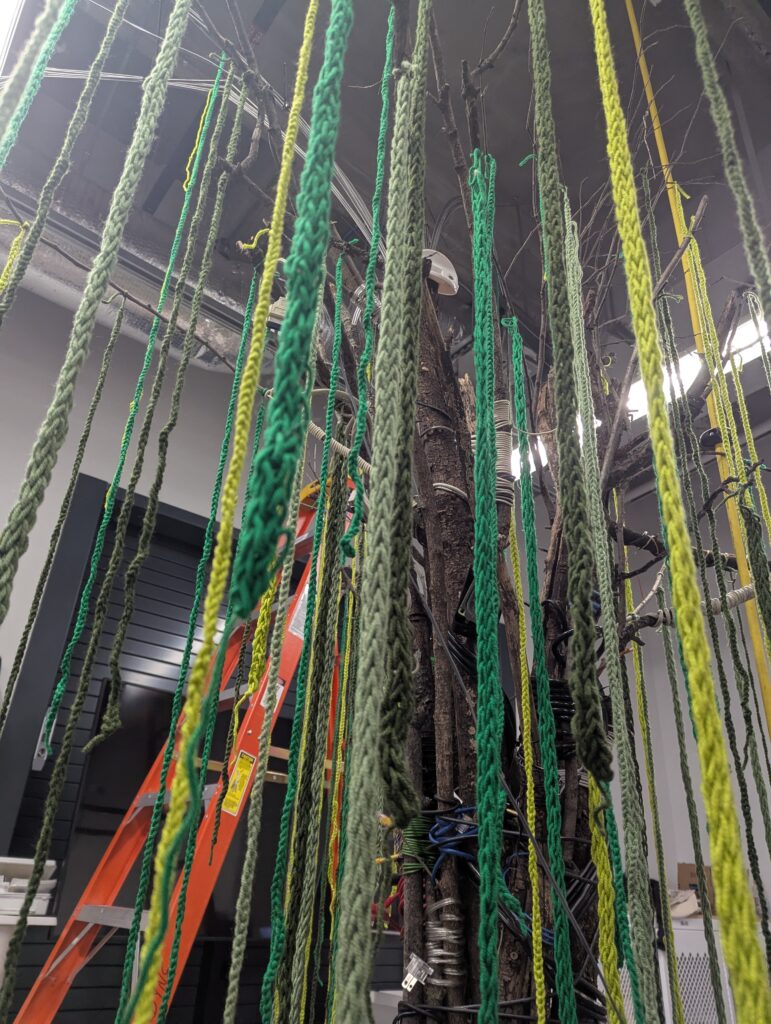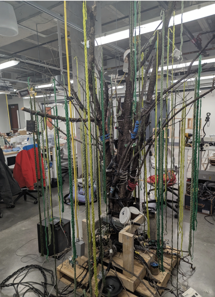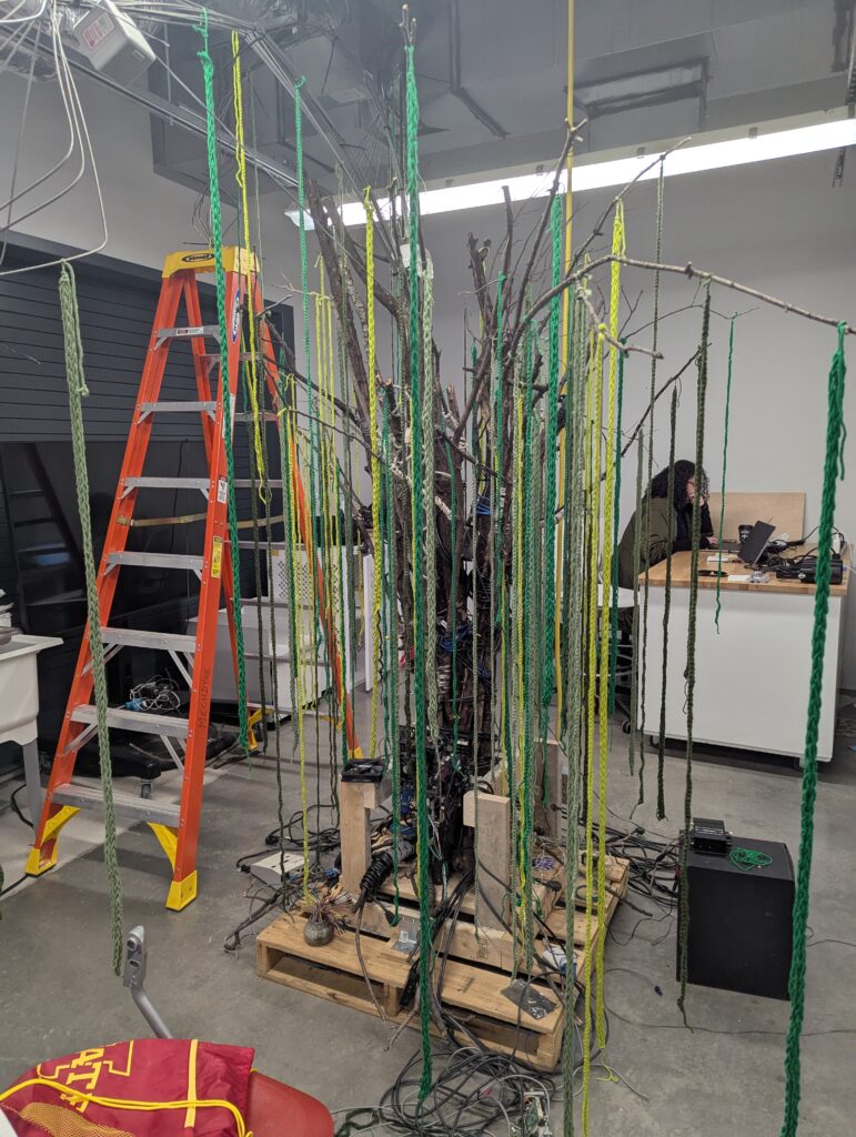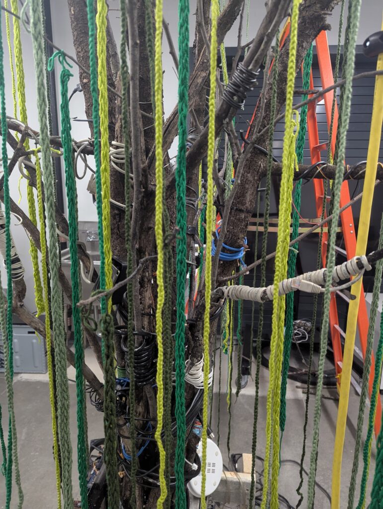 Use A real tree found dead in the woods near campus. Mount tree to pallet with necessary bracing to meet the mobile installation requirement. Attach wires to roots to develop the symbiotic/cross-mutated look and feel. Attach more e-waste as needed to continue the sense of a half organic half electronic organism. Add speakers, soundscape and interactivity. To build out the tree we impimented ceramics, coiling, and crochet to continue to build out the form.