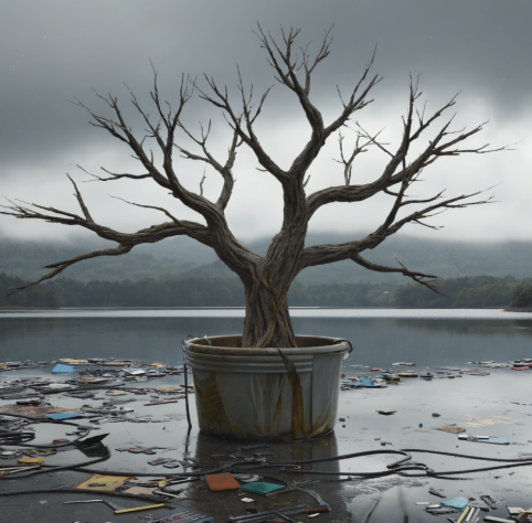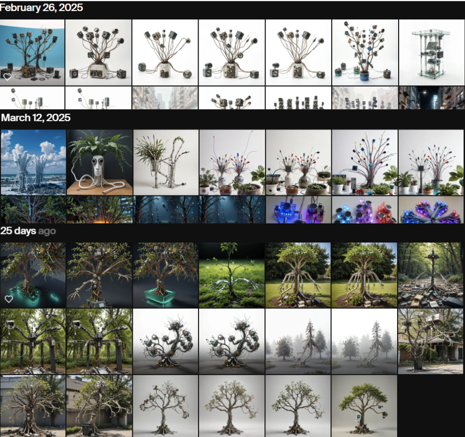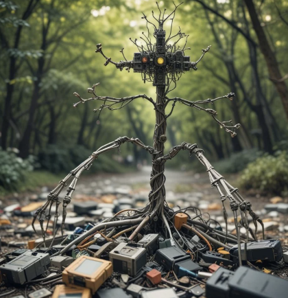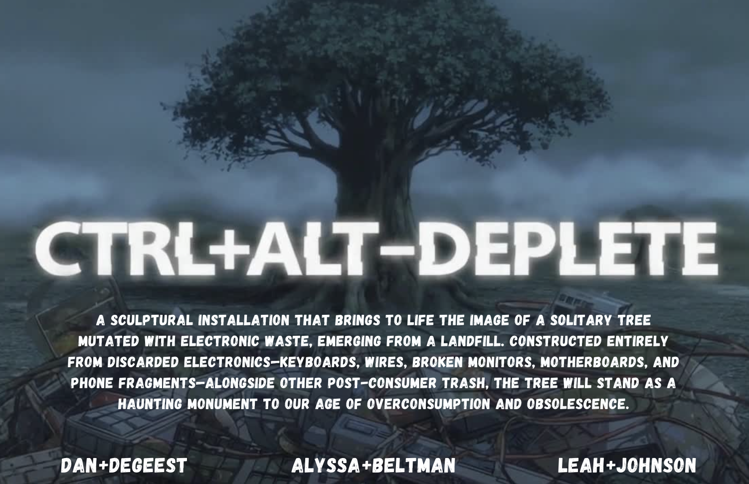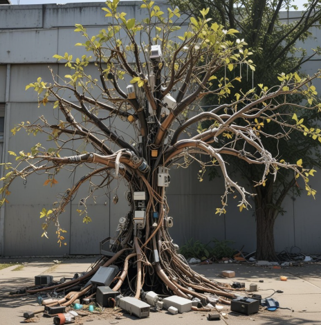 a sculptural installation that brings to life the image of a solitary tree mutated with electronic waste, emerging from a landfill. Constructed entirely from discarded electronics—keyboards, wires, broken monitors, motherboards, and phone fragments—alongside other post-consumer trash, the tree will stand as a haunting monument to our age of over consumption and obsolescence.